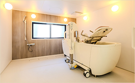 施設内には5か所の浴室と2つの特殊浴槽を備え、重度のご利用者様にも対応できる広々とした入浴スペースを確保しています。介助者と対面しながらの入浴も可能で、安心・安全にリラックスした時間をお過ごしいただけます。